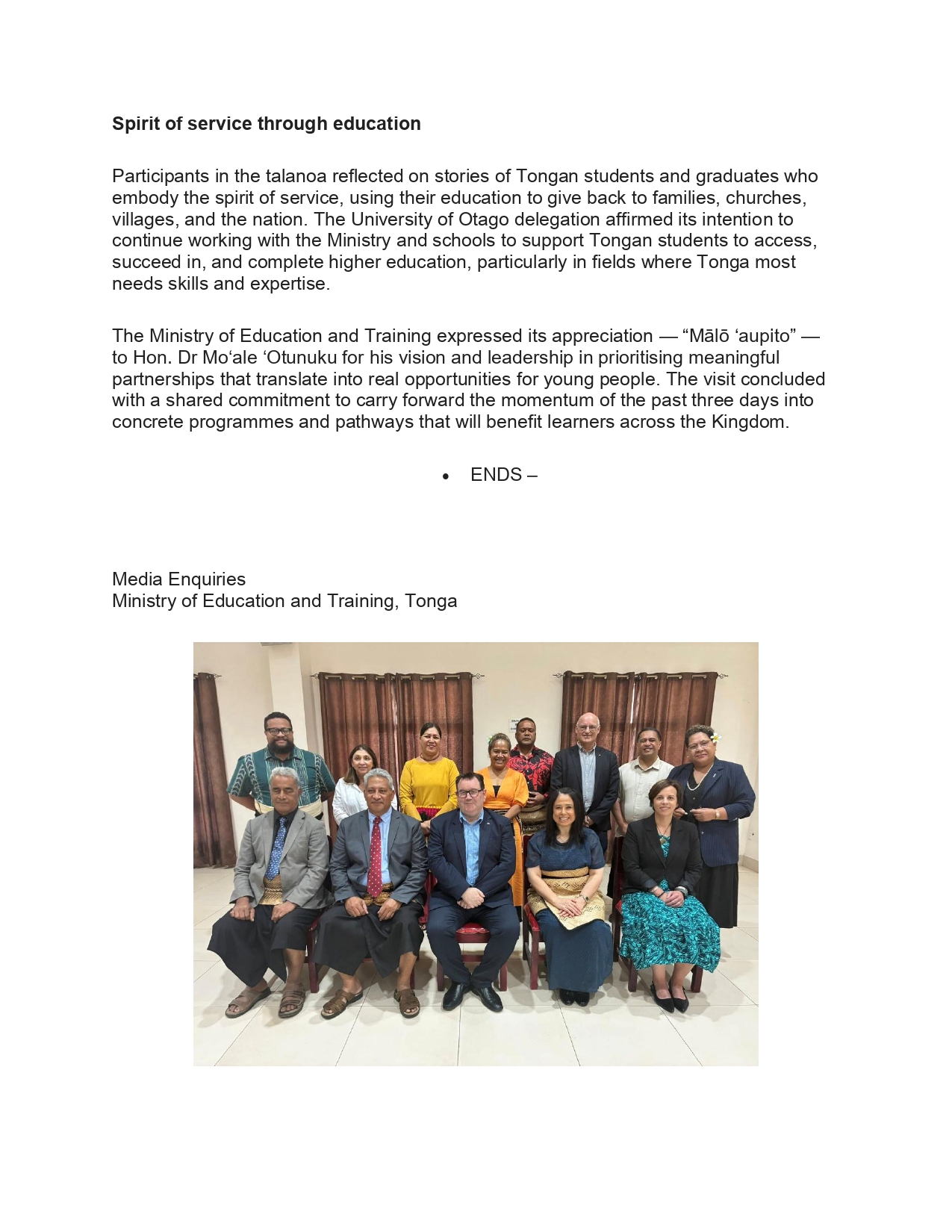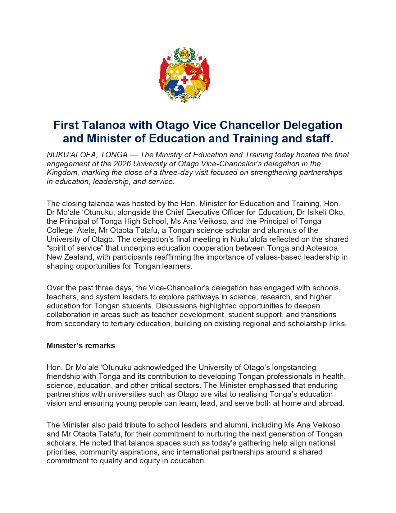 First Talanoa with Otago Vice Chancellor Delegation and Minister of Education and Training and staff.